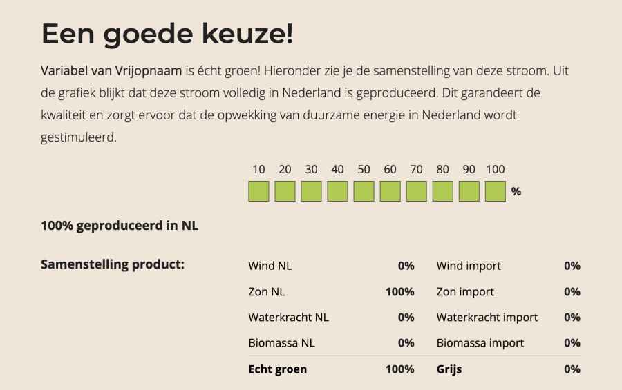 De groene stroom van Vrijopnaam wordt voor 100% in Nederland opgewekt en voldoet daarmee aan de eisen die de klimaatstichting HIER stelt aan echt groene stroom. Om mensen te helpen voor echt groene stroom te kiezen, onderzocht HIER voor de tiende keer de herkomst van stroomproducten die in Nederland als groen worden verkocht. De resultaten zijn verwerkt in de Groene stroom checker. Met de Groene stroom checker controleer je snel en makkelijk welk product wel écht groen is.